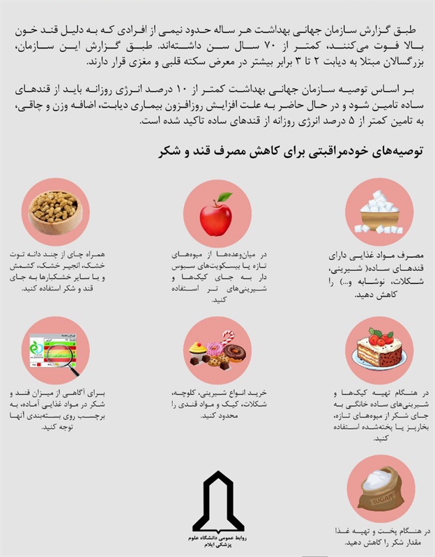 بر اساس توصیه سازمان جهانی بهداشت کمتر از ۱۰ درصد انرژی روزانه باید از قندهای ساده تأمین شود و در حال حاضر به علت افزایش روزافزون بیماری دیابت، اضافهوزن و چاقی، به تأمین کمتر از ۵ درصد انرژی روزانه از قندهای ساده تأکید شده است. در طرح فوق با برخی از توصیههای خودمراقبتی برای کاهش مصرف قند و شکر آشنا خواهید شد.