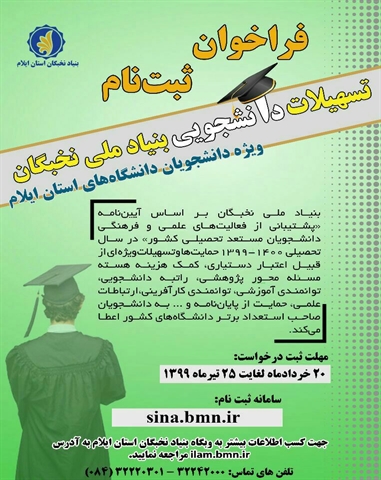 به اطلاع میرساند بنیاد ملی نخبگان در سال تحصیلی 1400-1399 اعتبارها و تسهیلات ویژه ای را به دانشجویان مستعد دانشگاهها و مراکز آموزشعالی کشور اعطا میکند.
